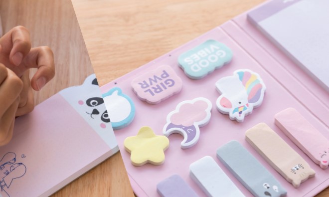 Egérkés öntapadó jegyzettömb és cicás jegyzetfüzet, öntapadós kiegészítőkkel, a cuki jegyzetekhez.